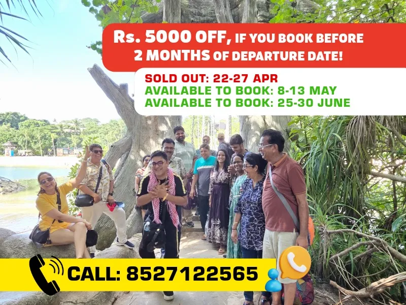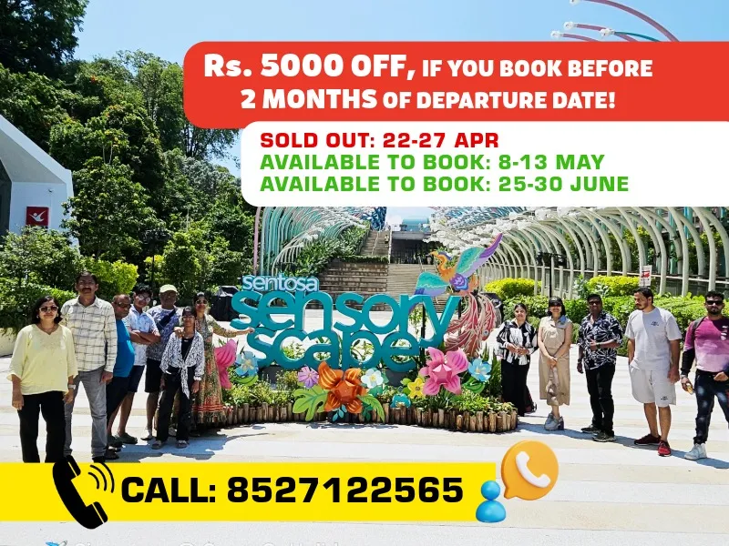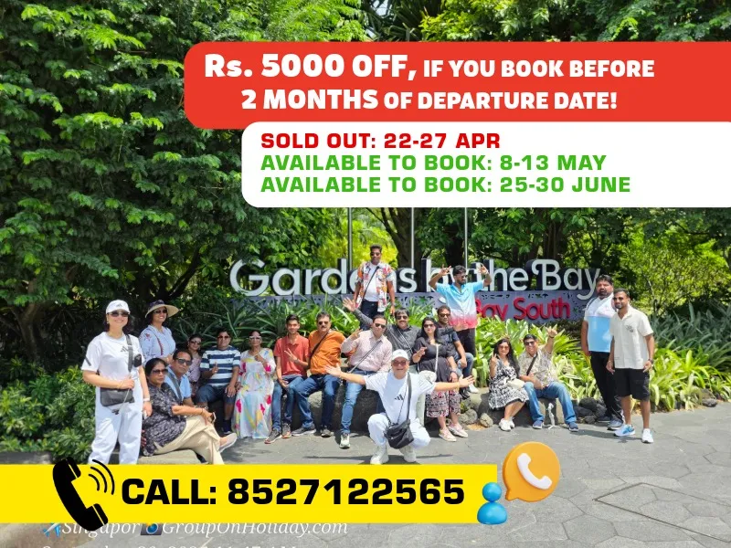Join Group On Holidays, rated 4.9 out of 5, for a 5-night, 6-day luxury trip to Singapore with owners Nitin Sharma and Poonam Sharma. Travel from Bangalore to the vibrant city of Singapore, set sail on a Singapore Cruise Adventure and explore its iconic landmarks, thrilling attractions, and world-class shopping. Get a chance to visit Malaysia & witness all the amazing sight seeing. Enjoy a comfortable flight, premium stays, and exclusive experiences at top destinations like Universal Studios, Sentosa Island, and Marina Bay Sands. After an unforgettable journey, return to Bangalore with incredible memories. This trip is designed for your comfort and luxury every step of the way!