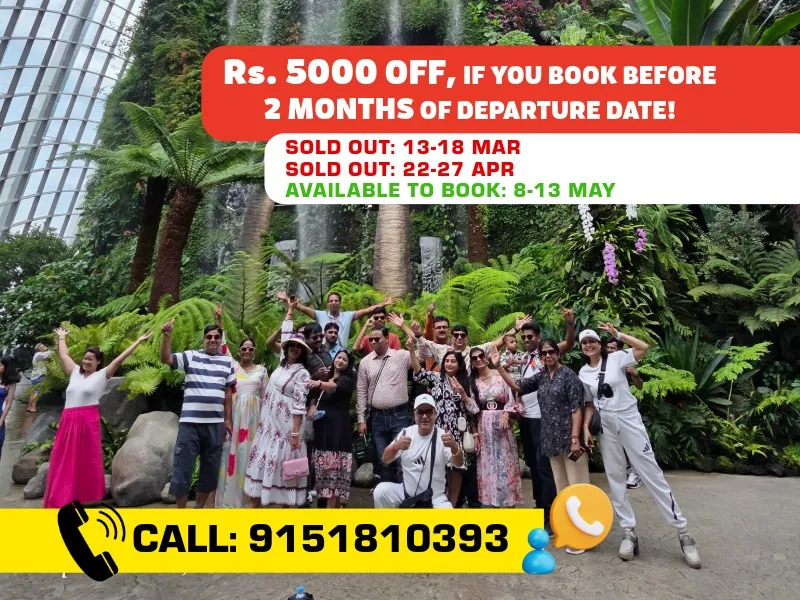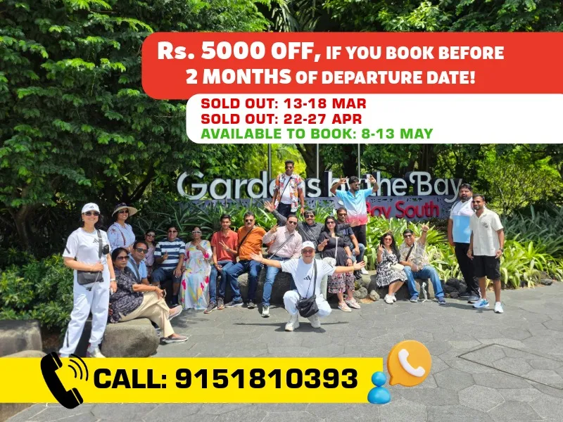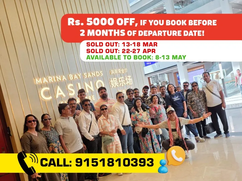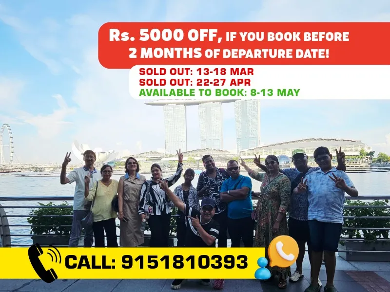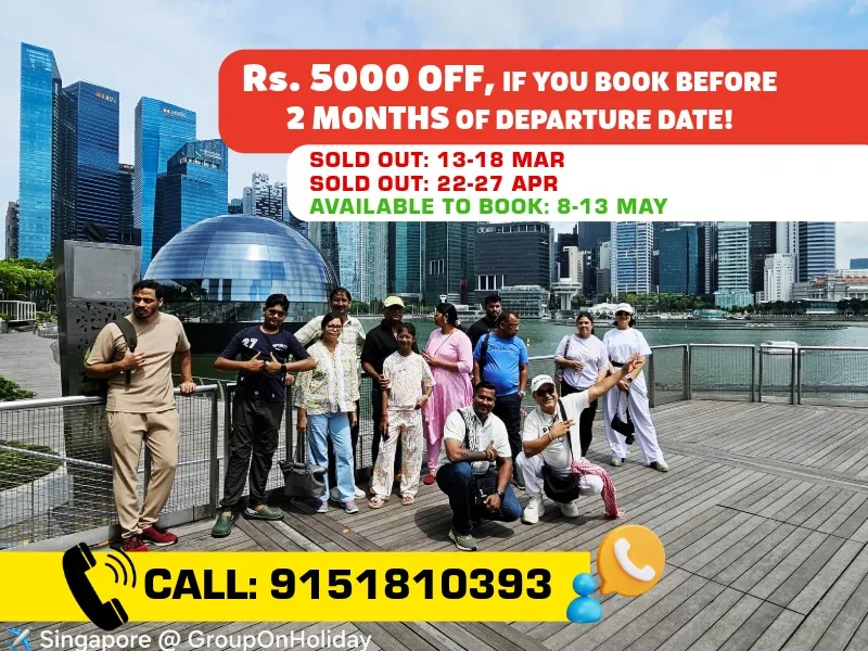 Join Group On Holidays, rated 4.9 out of 5, for a 5-night, 6-day luxury trip to Singapore with owners Nitin Sharma and Poonam Sharma. Travel from Chennai to the vibrant city of Singapore, set sail on a Singapore Cruise Adventure and explore its iconic landmarks, thrilling attractions, and world-class shopping. Get a chance to visit Malaysia & witness all the amazing sight seeing. Enjoy a comfortable flight, premium stays, and exclusive experiences at top destinations like Universal Studios, Sentosa Island, and Marina Bay Sands. After an unforgettable journey, return to Chennai with incredible memories. This trip is designed for your comfort and luxury every step of the way!