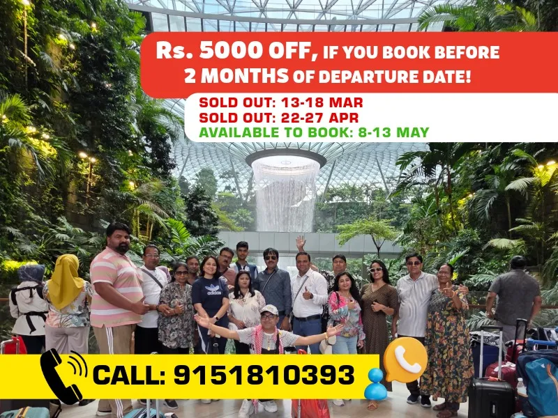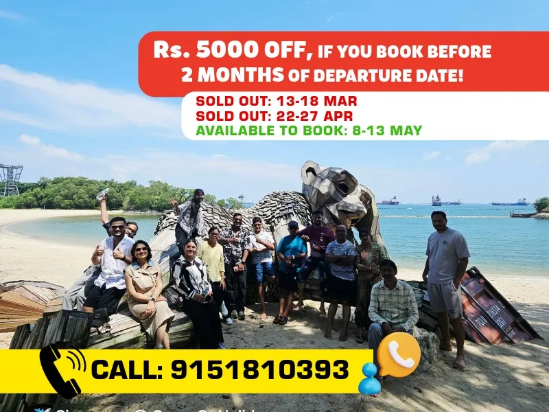 Join Group On Holidays, rated 4.9 out of 5, for a 5-night, 6-day luxury trip to Singapore with owners Nitin Sharma and Poonam Sharma. Travel from New Delhi to the vibrant city of Singapore, set sail on a Singapore Cruise Adventure and explore its iconic landmarks, thrilling attractions, and world-class shopping. Get a chance to visit Malaysia & witness all the amazing sight seeing. Enjoy a comfortable flight, premium stays, and exclusive experiences at top destinations like Universal Studios, Sentosa Island, and Marina Bay Sands. After an unforgettable journey, return to New Delhi with incredible memories. This trip is designed for your comfort and luxury every step of the way!