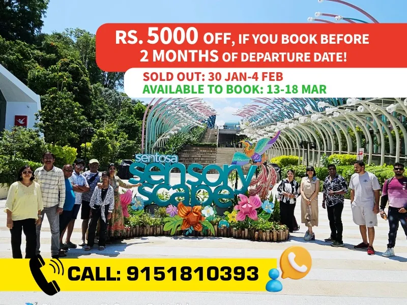 Join Group On Holidays, rated 4.9 out of 5, for a 5-night, 6-day luxury trip to Singapore with owners Nitin Sharma and Poonam Sharma. Travel from Mumbai to the vibrant city of Singapore, set sail on a Singapore Cruise Adventure and explore its iconic landmarks, thrilling attractions, and world-class shopping. Get a chance to visit Malaysia & witness all the amazing sight seeing. Enjoy a comfortable flight, premium stays, and exclusive experiences at top destinations like Universal Studios, Sentosa Island, and Marina Bay Sands. After an unforgettable journey, return to Mumbai with incredible memories. This trip is designed for your comfort and luxury every step of the way!